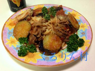 スパゲティの、材料は、茄子、ホールトマト、ニンニク、粉チーズ、などです。ナスは、片栗粉を、まぶしてから揚げます。